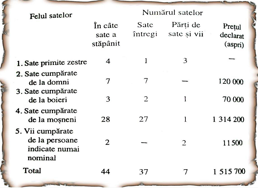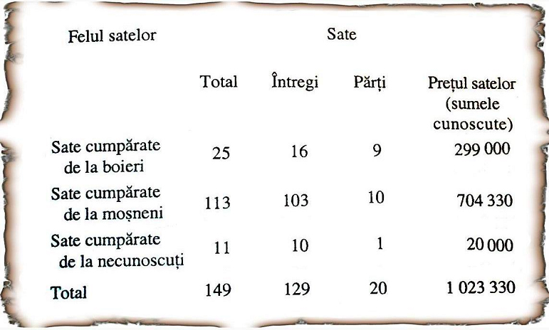 Acelaşi istoric, Ion Donat arată că „într-o domnie efectivă de aproximativ şase ani, Mihai a cumpărat 64,5% din totalul satelor cumpărate până la 1600 de toţi domnii Ţării Româneşti la un loc […]. Predecesorii lui Mihai Viteazul şi-au cumpărat satele, în marea majoritate a cazurilor de la boieri; pe când din cele 149 de sate ale lui Mihai numai 25 au fost boiereşti. În schimb, domnii de până la el au cumpărat doar 5 sate de moşneni, faţă de 113 cumpărate de Mihai Viteazul. Aceasta înseamnă că din totalul satelor rumânite prin cumpărare, până la 1600, Mihai Viteazul a rumânit 95,7%”. Constituirea acestui domeniu-record al domnului s-a făcut adesea cu mijloace silnice, care au lovit nemilos în moşneni (ţărani, proprietari de pământ din Ţara Românească în Evul Mediu),ele fiind evocate şi în documente.