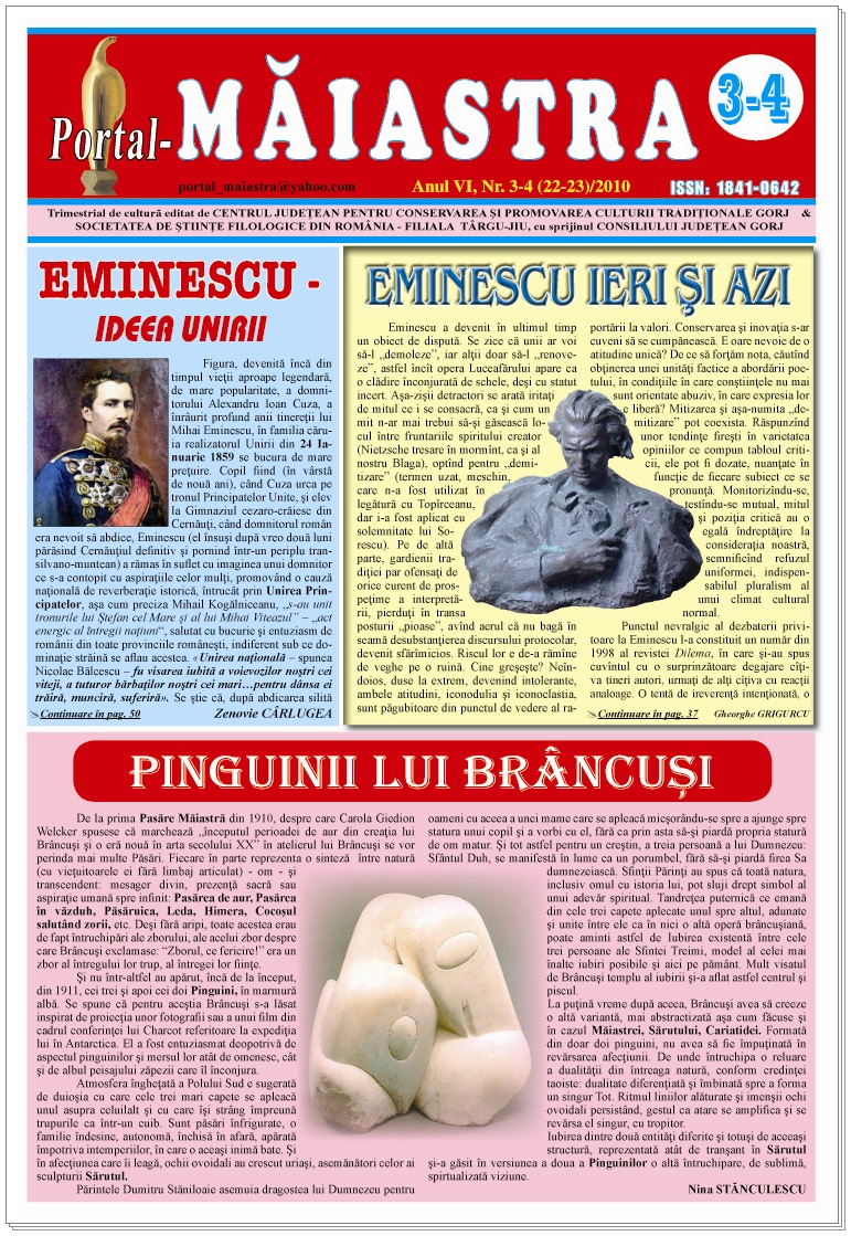 Am primit de curând din partea domnului prof. dr. Zenovie Cârlugea, preşedintele Societăţii de Ştiinţe Filologice din România – Filiala Târgu-Jiu, ultimele două numere ale trimestrialului de cultură „Portal-MĂIASTRA”.
