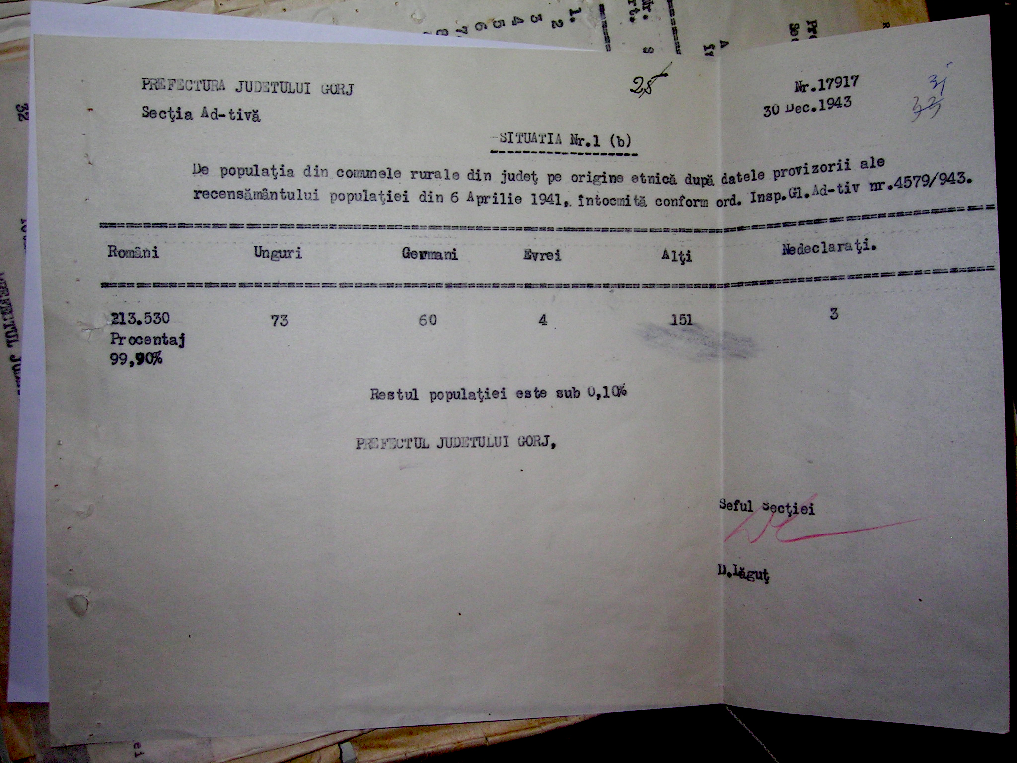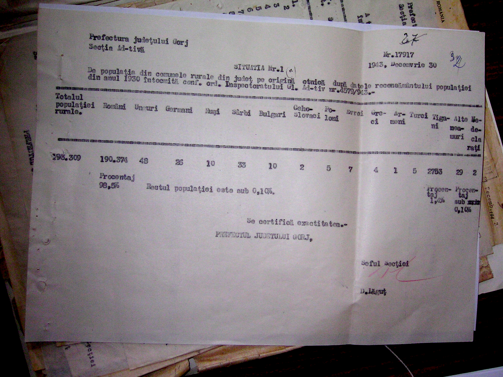 De curând am identificat în fondurile Serviciului Judeţean al Arhivelor Naţionale Gorj, după datele recensământului general din anul 1930, situaţia pe criteriu etnic a populaţiei din comunele rurale ale judeţului Gorj. Astfel, din totalul de 193.309 locuitori, 190.374 erau români (98,5%), 48 unguri, 26 germani, 10 ruşi, 33 sârbi, 10 bulgari, 2 cehoslovaci, 5 polonezi, 7 evrei, 4 greci, 1 armean, 5 turci, 1.753 ţigani (1,4%), 29 alţi cetăţeni, 2 nedeclaraţi.[1]