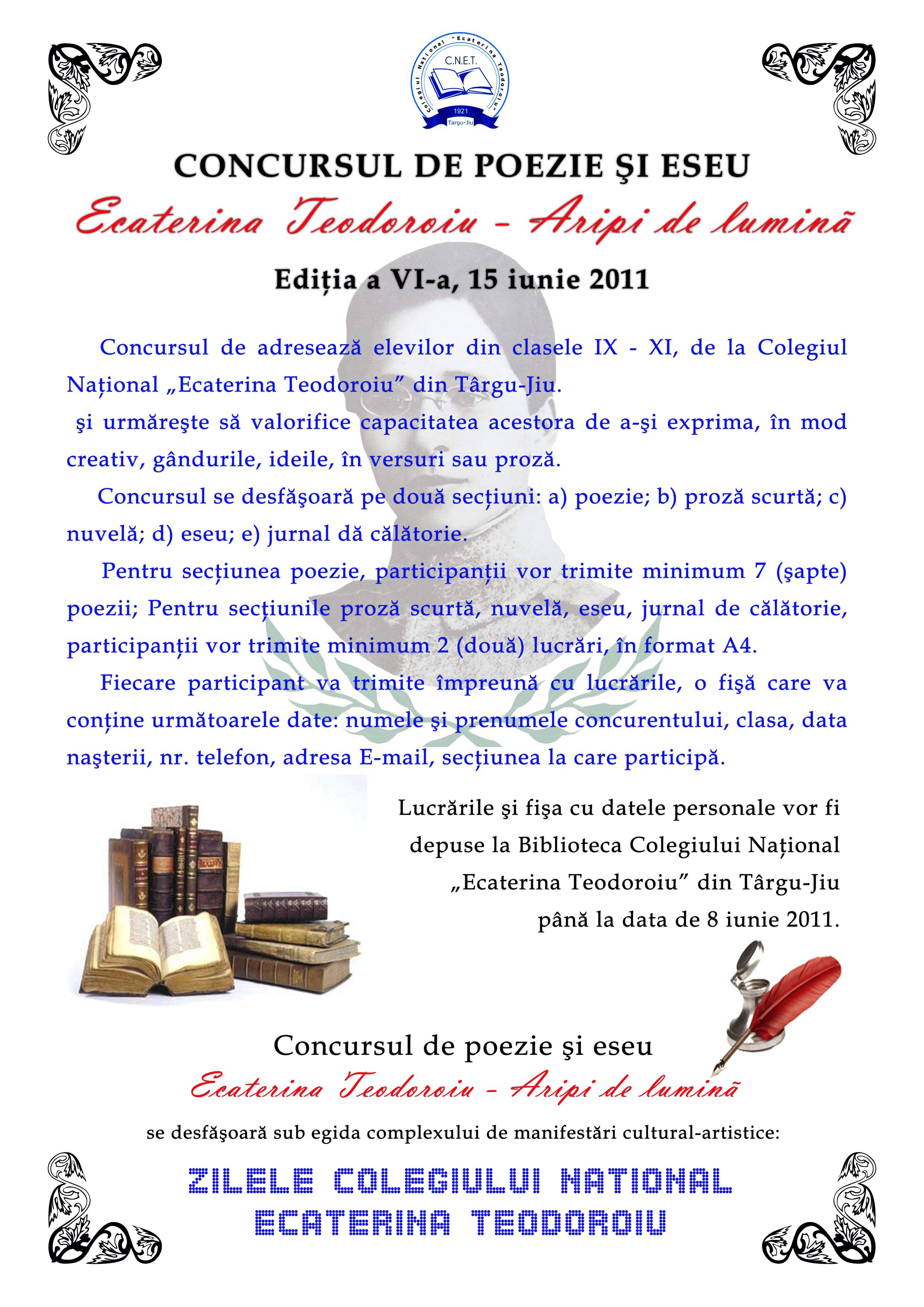 Concursul de poezie şi eseu ECATERINA TEODOROIU – ARIPI DE LUMINĂ, Ediţia a VI-a, 15 iunie 2011 admin.29 mai 201129 mai 2011andrei popete Navigare în articole PrecedentUrmător Apreciază Încarc...