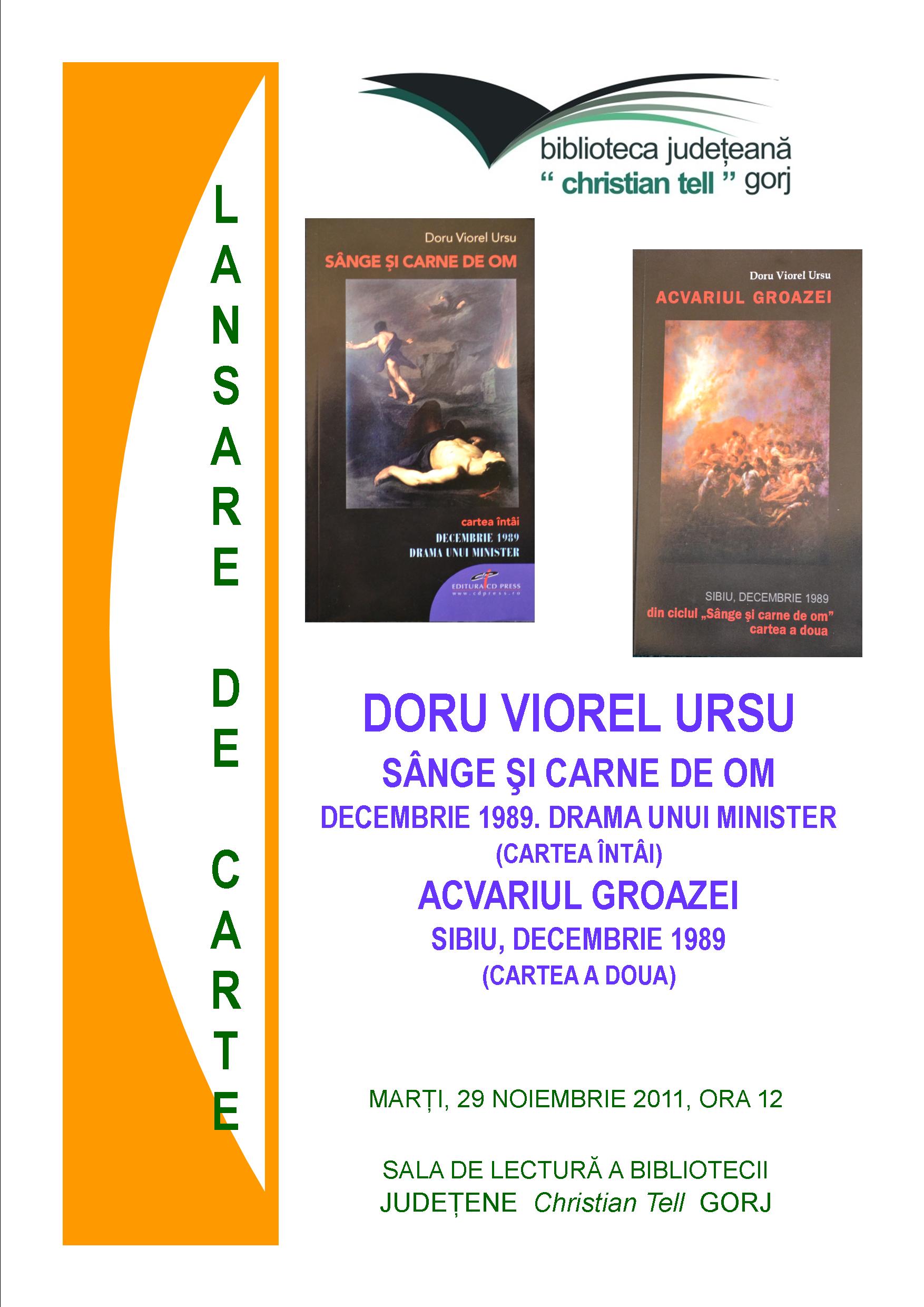 Biblioteca Judeţeană Christian Tell Gorj vă invită marţi, 29 noiembrie 2011, ora 12, în sala de lectură Mihai Eminescu, pentru a participa la prezentarea volumelor SÂNGE ŞI CARNE DE OM. Decembrie 1989. Drama unui minister şi ACVARIUL GROAZEI. Sibiu, Decembrie 1989, al căror autor este domnul DORU VIOREL URSU.