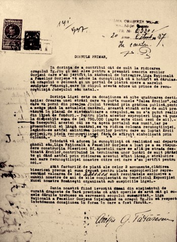 În actul de donaţie aflat în fondurile Serviciului Judeţean Gorj al Arhivelor Naţionale, prin care Liga Femeilor Gorjene, condusă de Arethia Tătărescu, a donat oraşului Târgu-Jiu „pentru a preamări memoria eroilor gorjeni care s-au jertfit în războiul de întregire”, „o coloană şi un portal de piatră opere a marelui sculptor Brâncuşi, care în chipul acesta aduce un prinos de recunoştiinţă judeţului său natal”, sunt precizate numele a două dintre operele de inestimabilă valoare, altfel decât le cunosc majoritatea gorjenilor şi nu numai.