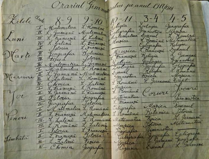 În fondurile Serviciului Județean Gorj al Arhivelor Naționale am identificat orarul gimnaziului pentru anii 1917-1918. Elevii studiau limba română, limba franceză, limba latină, limba germană, matematică, geografie, zoologie, geologie, caligrafie, religie, botanică, fizică, chimie, higienă, muzică, gimnastică, desen, dar și două ore de istorie la fiecare clasă.