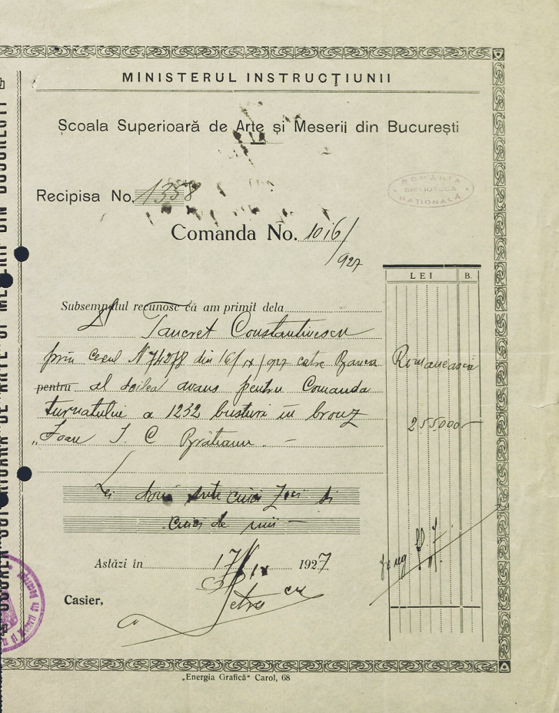 Dintr-o recipisă a Școlii Superioare de Arte și Meserii din București aflăm că în anul 1927, Tancret Constantinescu (membru în conducerea P.N.L., deputat și senator, în câteva legislaturi, director general al CFR, Secretar general la Ministerul Comerțului și Industriei), fost ministru al Industriei și Comerțului în Guvernul Ion I.C. Brătianu (30 octombrie 1923 – 29 martie 1926), achita „către Banca Românească, al doilea avans pentru comanda turnatului a 1232 busturi în bronz <>”, în valoare de 255.000 lei. (Biblioteca Națională a României, Fond AI F Brătianu-u.a.I1-inv.143, Cota AIFB I1)